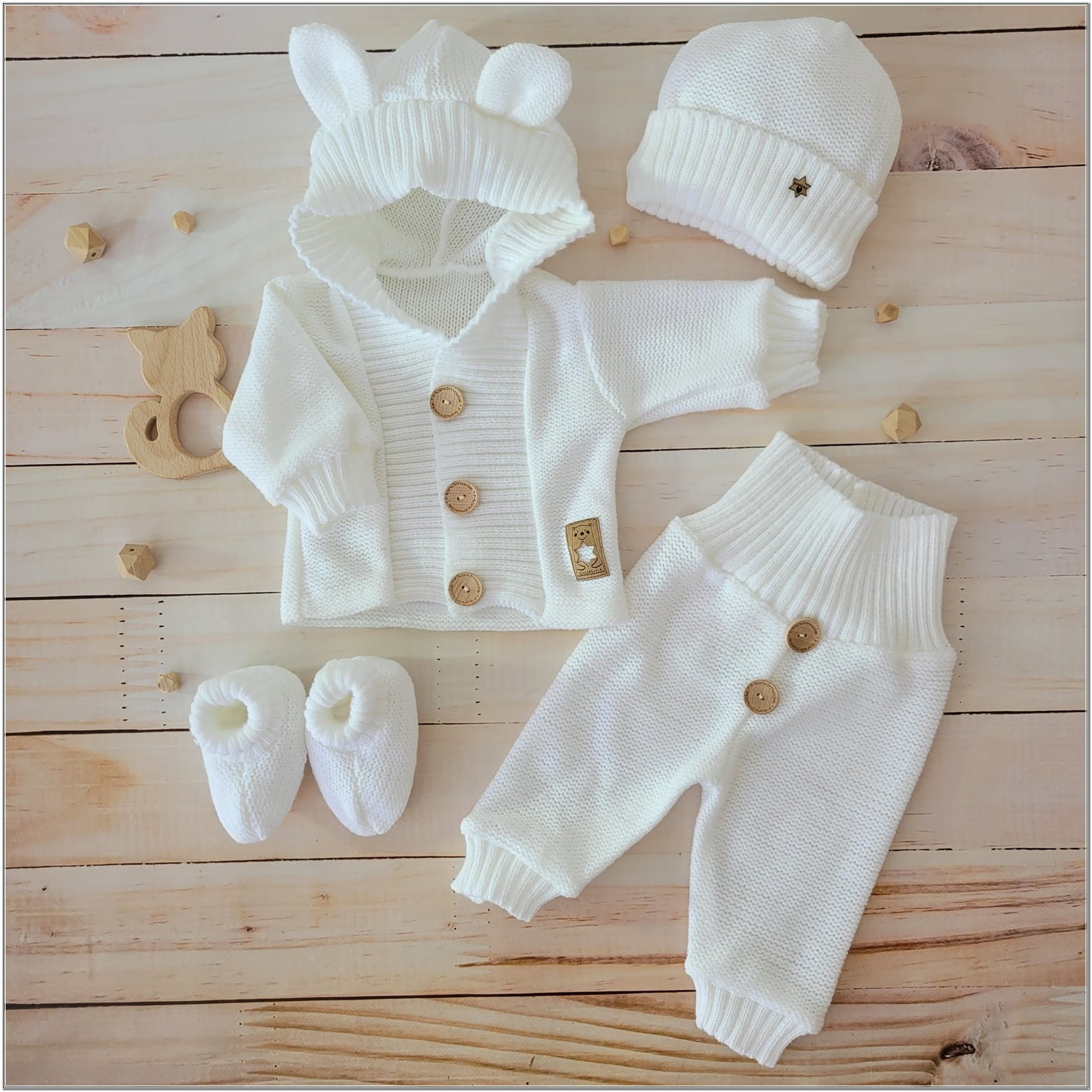 Pletená súprava do pôrodnice alebo na slávnostnú príležitosť. Súprava obsahuje : pletené nohavice s ozdobnými gombíkmi pletená mikina s kapucňou pletená čiapka pletené papučky Zloženie : 100 % acryl celý popis