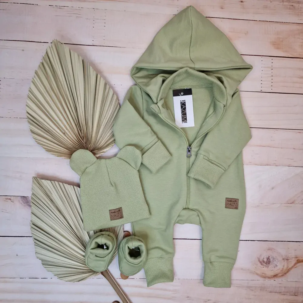 Overal, tepláková kombinéza bez nôh s odnímateľnou kapucňou + čiapka + topánočky. Univerzálny set: overal, čiapka + topánky na jar, leto a jeseň. Ideálne na chladné dni pod spací vak pre bábätko. Jednovrstvové oblečenie pre novorodencov a dojčatá. Zloženie : Overal 95% bavlna, 5% elastan Čiapka 95% bavlna 5% elastan Topánky 95% bavlna 5% elastan Na rukávoch a nohaviciach sú dlhé manžety, vďaka ktorým oblečenie rastie s dieťaťom. Teplákový overal poskytne vášmu dieťaťu pohodlie na jarných, jesenných a dokonca aj letných prechádzkach.