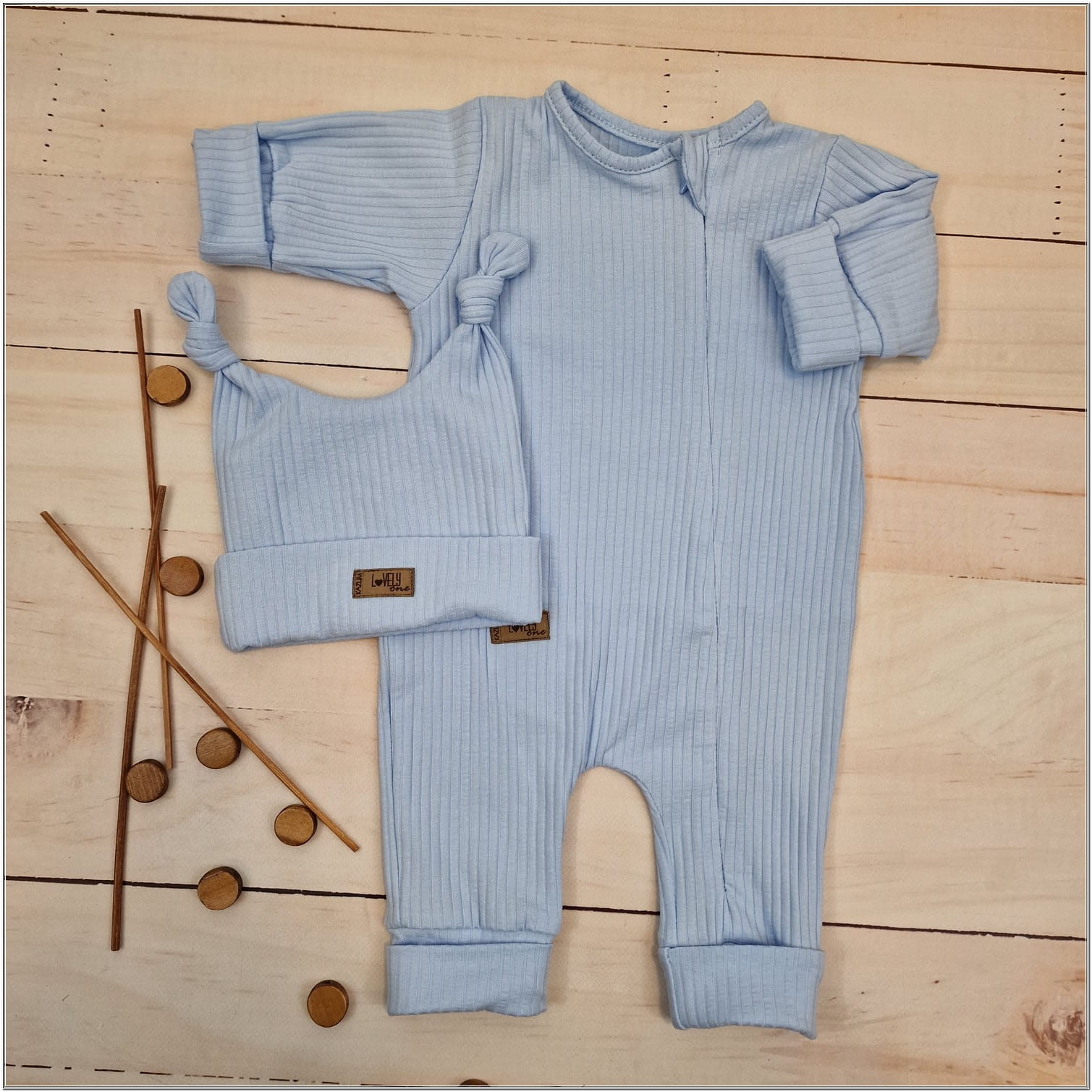 Očarujúca 2-dielna bavlnená, rebrovaná letná súprava - detský overal a čiapočka. Overal sa zapína na zips