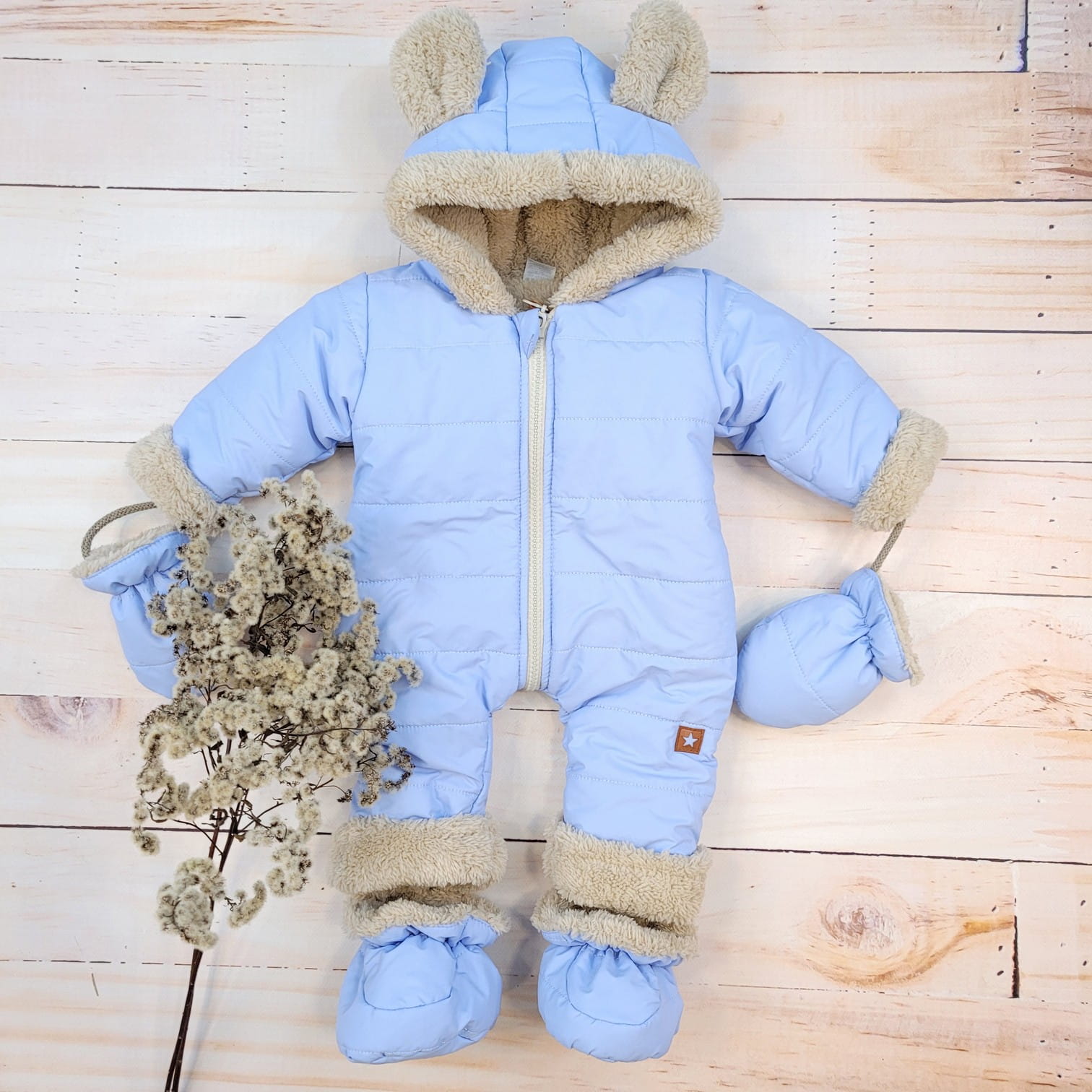 K overalu sú dodávané rukavice a šnúrkové topánky. Kapucňa má očarujúce uši.